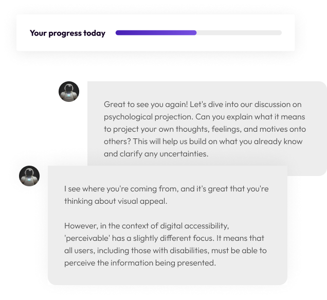 Practice with human-like tutoring sessions and keep track of your progress. The AI tutor understands your challenges to maximize your learning.