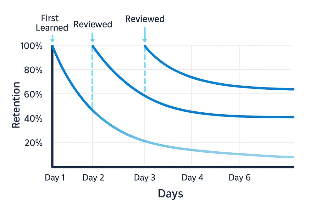 Forgetting Curve: Hermann Ebbinghaus discovered that we forget information exponentially over time. Without reinforcement, we lose about 50% of new information within an hour and up to 90% within a week.